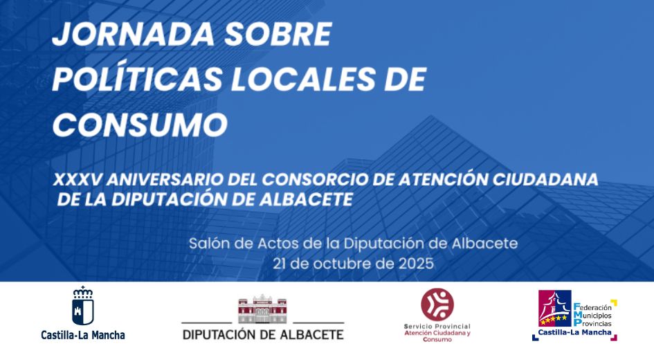 La Federación de Municipios y Provincias de Castilla-La Mancha (FEMPCLM) y la Dirección General de Salud Pública de la Consejería de Sanidad han organizado la Jornada sobre “Políticas Locales de Consumo”, que se celebrará el próximo día 21 de octubre en el Salón de Actos de la Excma. Diputación Provincial de Albacete (Paseo de la Libertad, 5).
